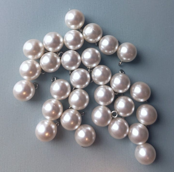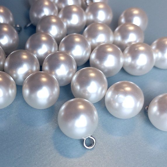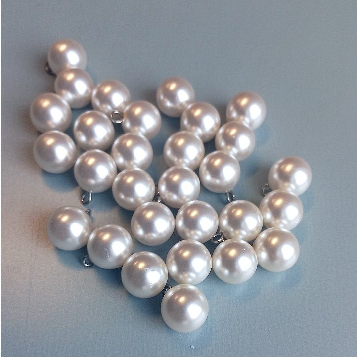Törtfehér színű, műanyag gyöngygomb fém füllel. Átmérő: 13 mm