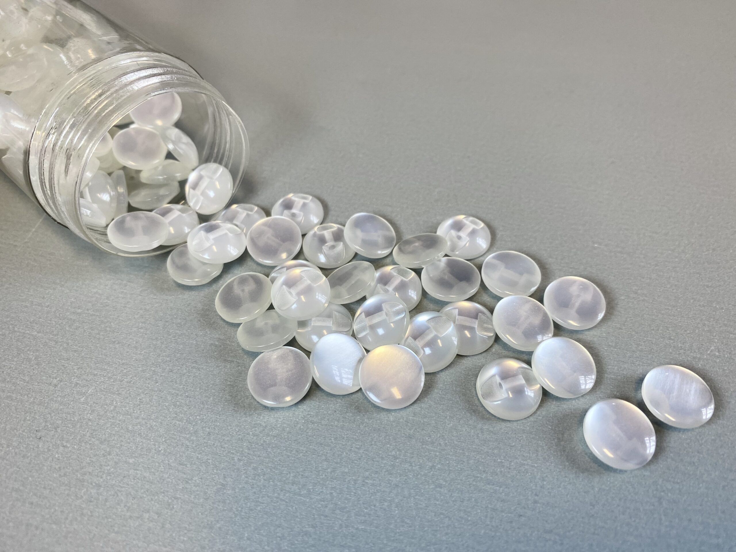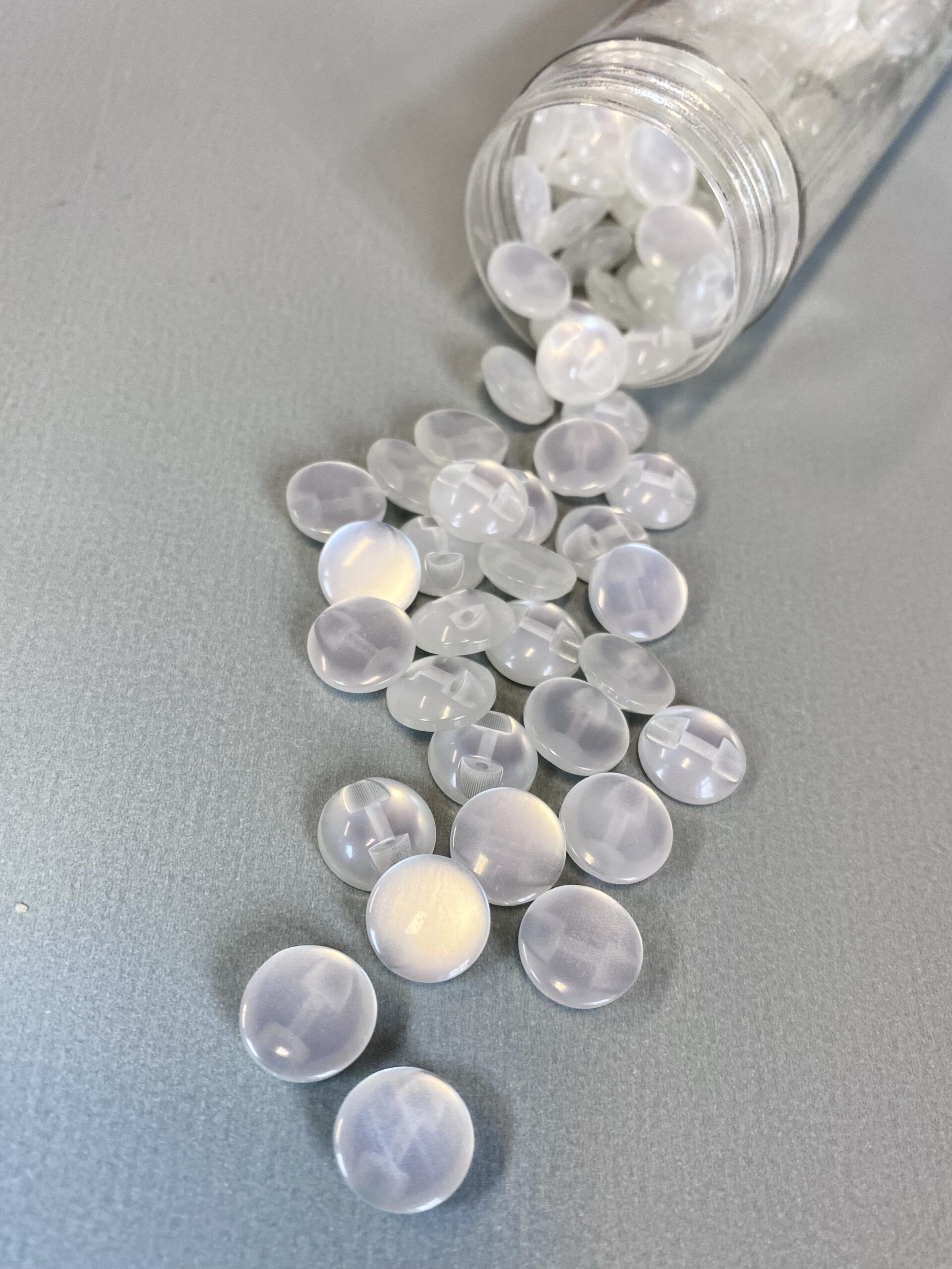 Törtfehér színű, alján átvarrható gomb. Átmérő: 11 mm