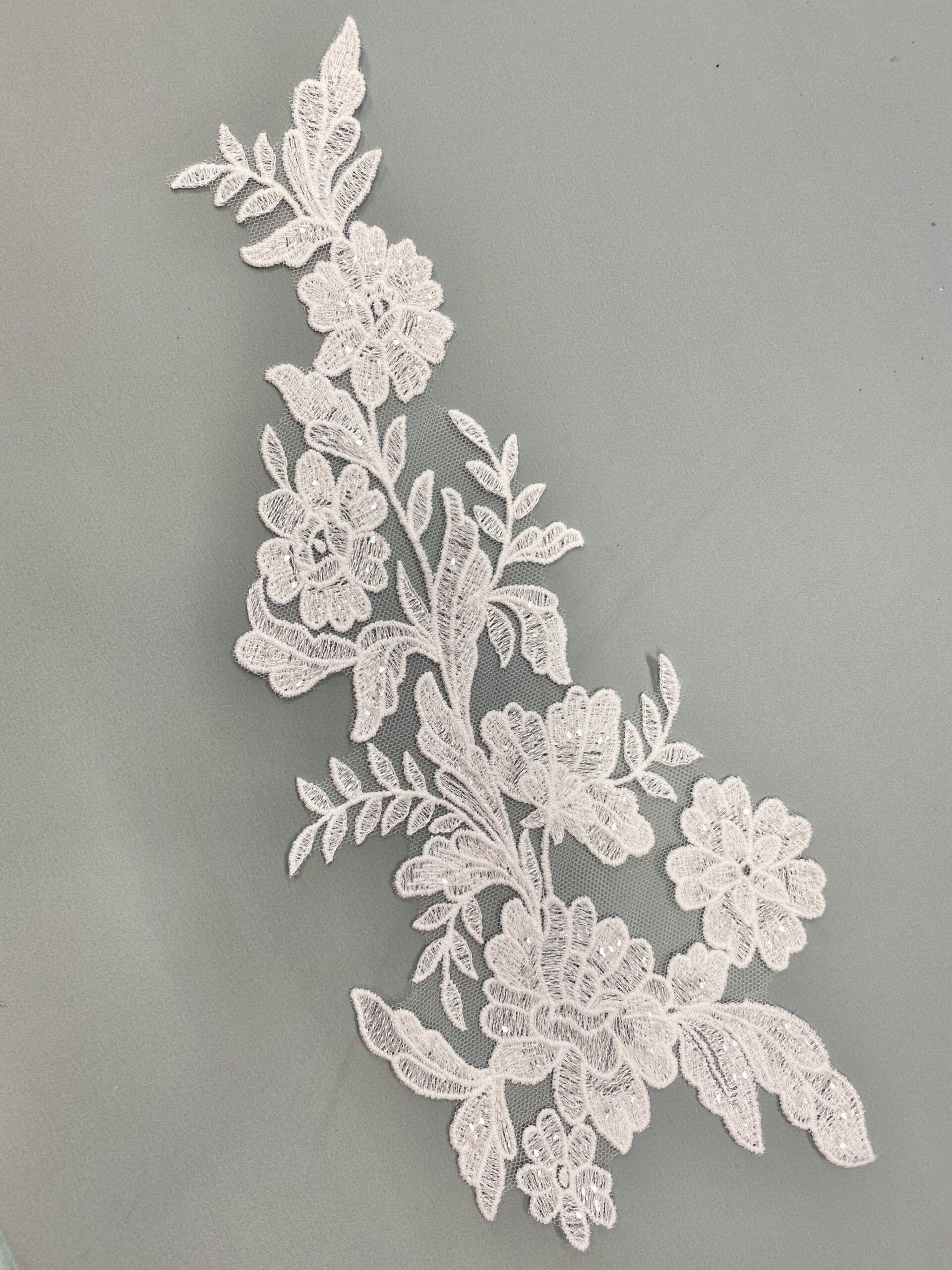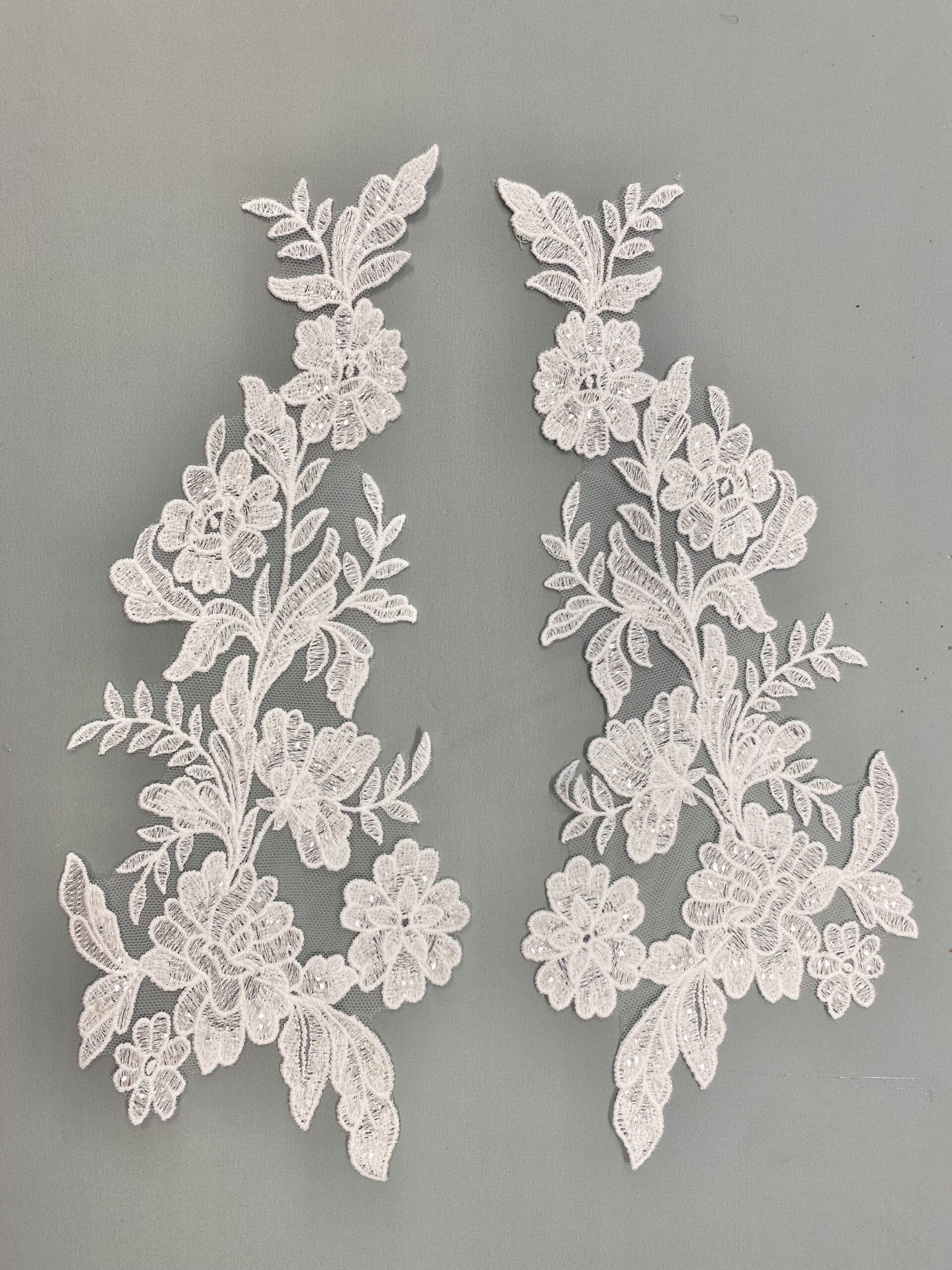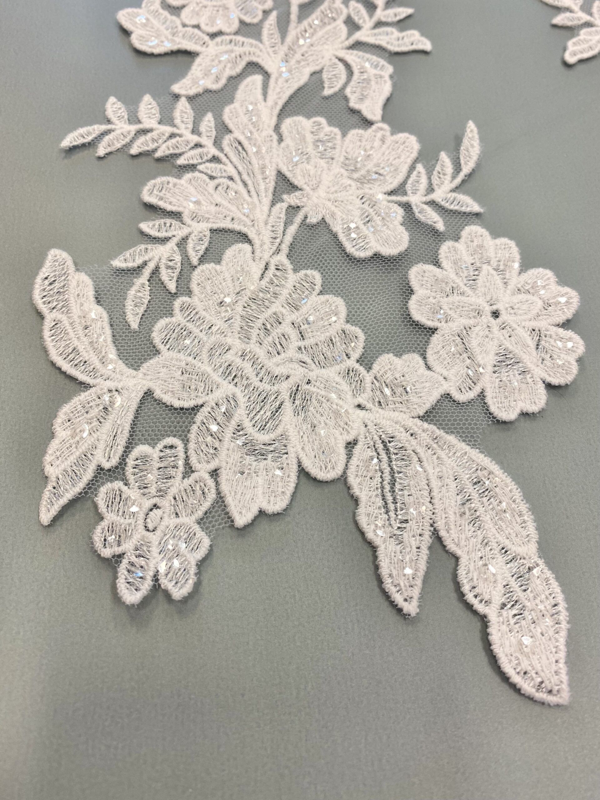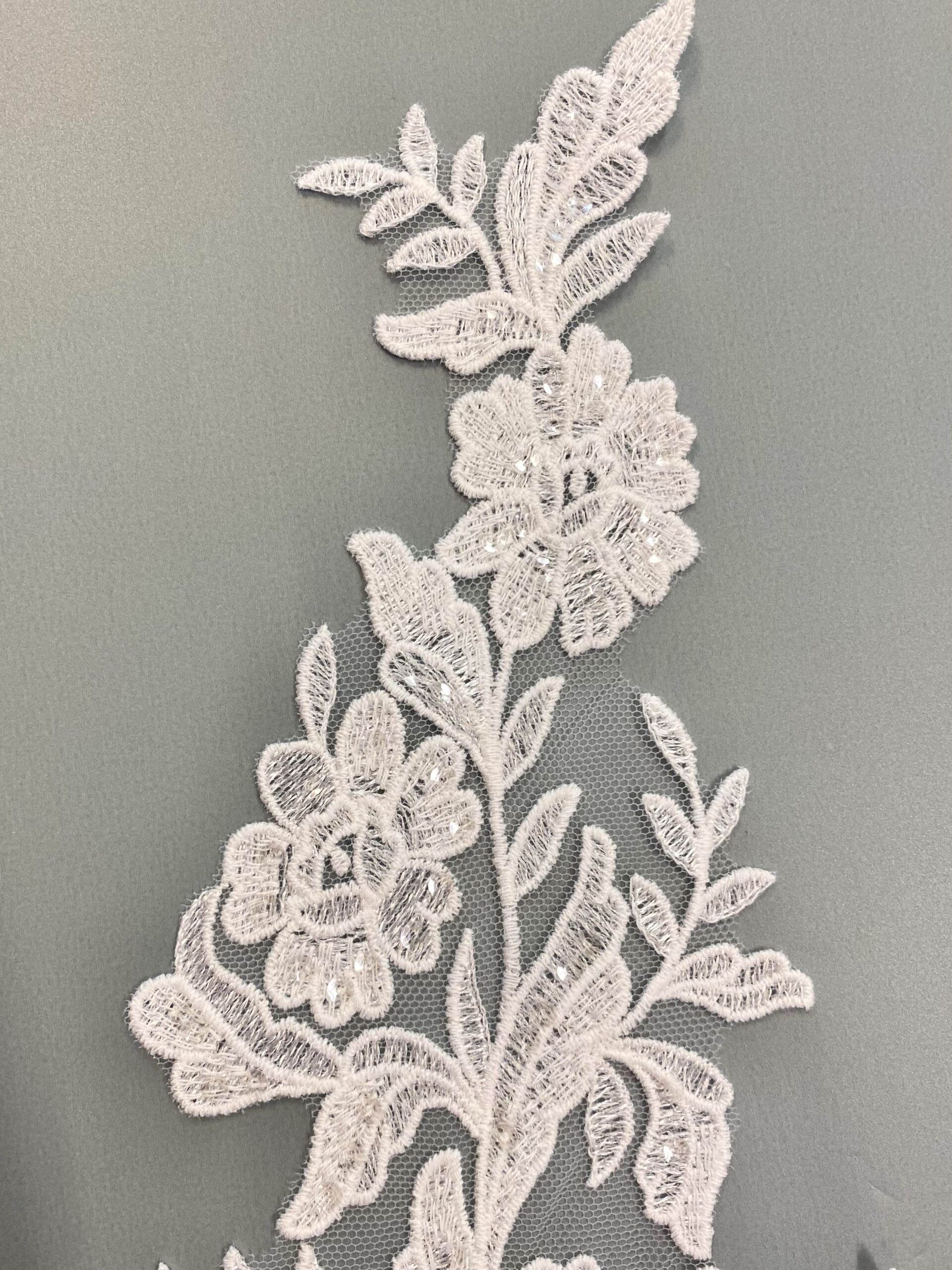 Törtfehér színű virágos-leveles páros csipke, átlátszó flitteres díszítéssel.