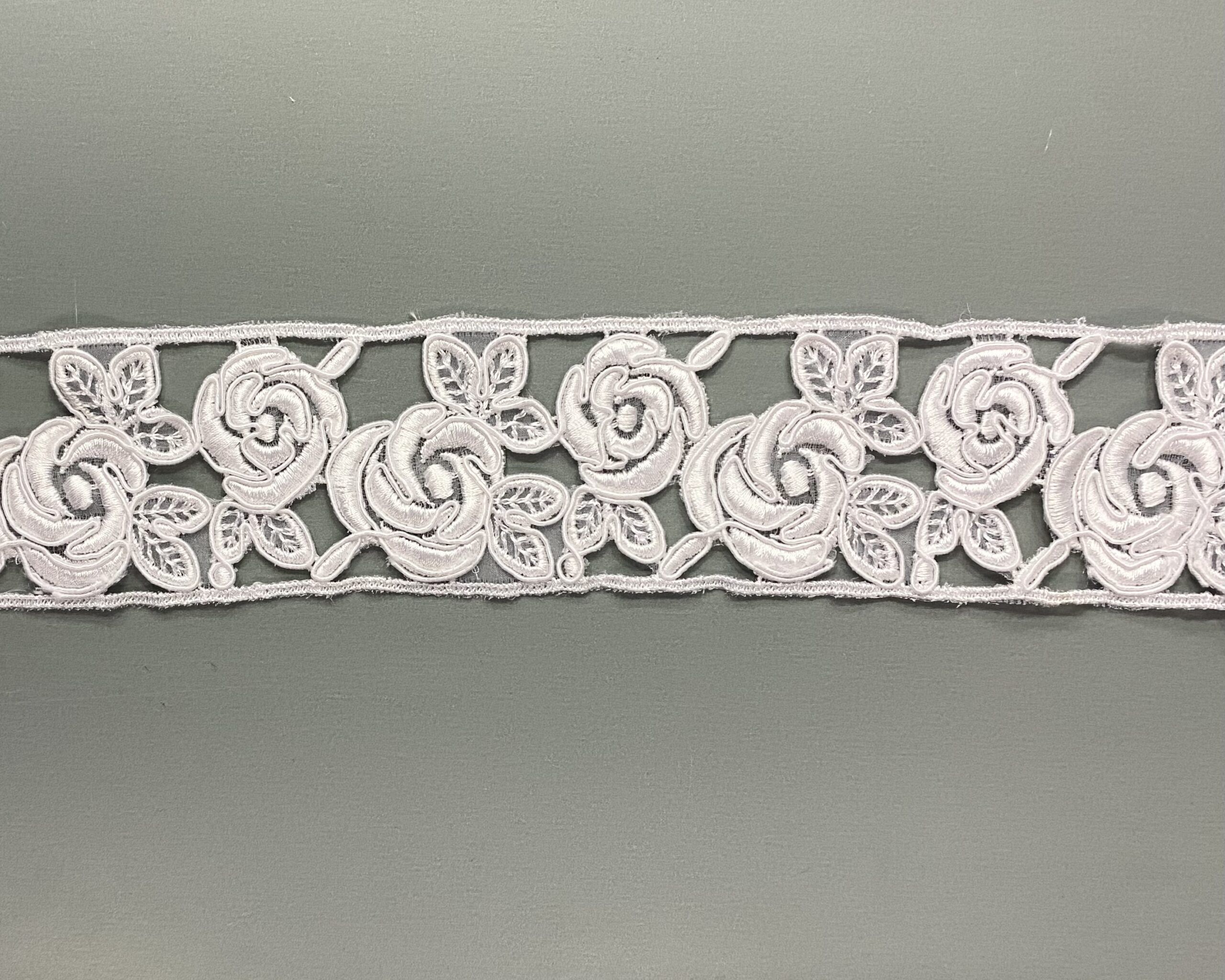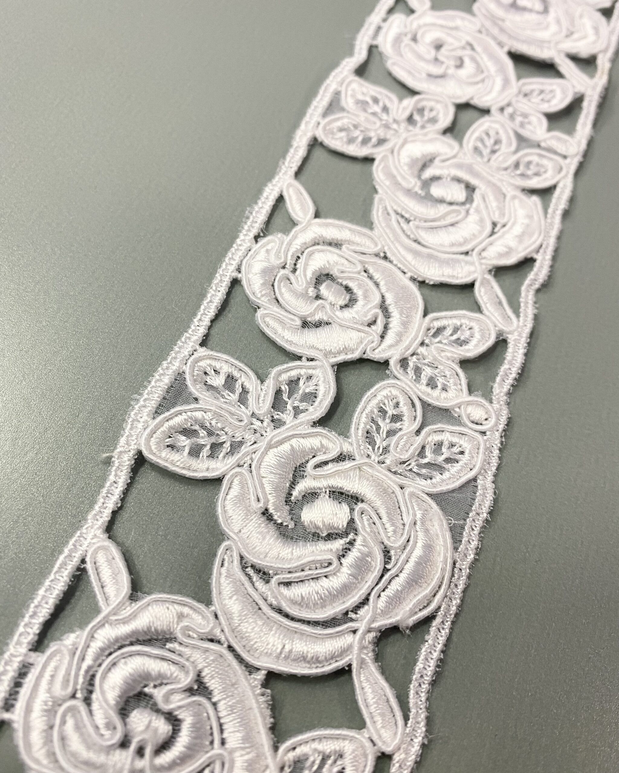 Fehér, organza alapra hímzett zsinóros szegő csipke.