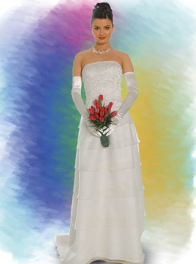 Krém ,,A” vonalú menyasszonyi ruha, felső részén finom gyöngy díszítés. Hátulján zipzáras. Egy részes.
