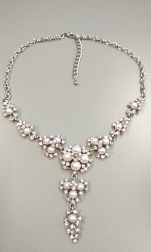 Ezüst színű nyaklác strasszkövekkel és tekla gyöngyökkel díszítve. Hossza állítható. Készleten elérhető: 1db